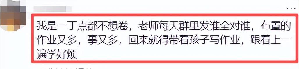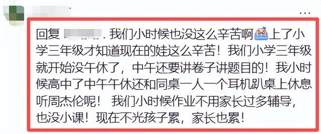 还有家长吐槽现在的教育太离谱。小学三年级的娃,中午连午休都没有,老师抓着时间讲题、做卷子。家长小时候哪有这么苦?作业写完就完事,哪像现在,家长得当“陪读机器”,每天盯着孩子写作业,累得够呛。
