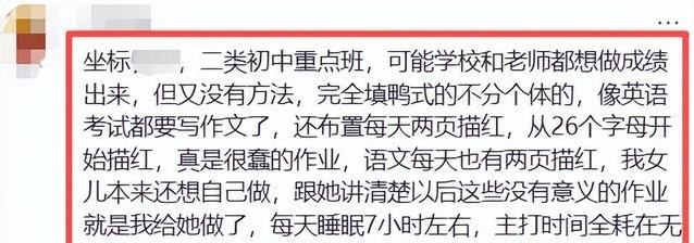 一位家长的话特别真实:老师每天在群里晒谁考满分,布置的作业多得吓人,孩子每天忙得像个陀螺。英语考试都要写作文了,老师还让练两页描红,语文也是两页描红。孩子每天睡不到7小时,时间全花在这些重复的作业上,学得苦不堪言。