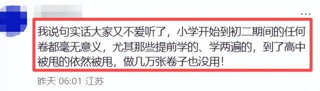 家长们在评论区吵翻了天。有人说,小学到初二的内卷没啥意义,孩子天赋不够,做再多题也白搭。可马上有人反驳:在江苏这地方,小学初中不拼,哪来的好高中?这话听着扎心,但现实就是这么残酷。